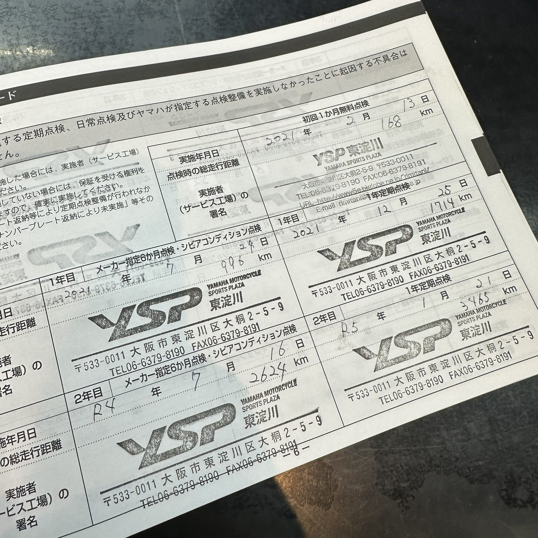 メンテナンス履歴が記録されているバイクは安心です。過去にどのような整備が行われてきたか、購入前に確認しましょう。YSP東淀川の中古車は全て過去の整備履歴がある物のみの販売となりますので安心して購入頂けます!